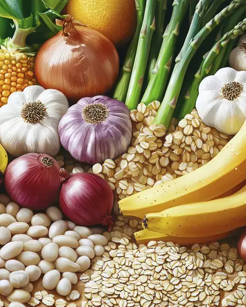 Prebióticos são fibras que alimentam as bactérias benéficas do intestino. São encontrados em alimentos como alho, cebola, aspargo, banana verde, aveia e grãos integrais. Aumentar a ingestão de prebióticos gradualmente é recomendado.